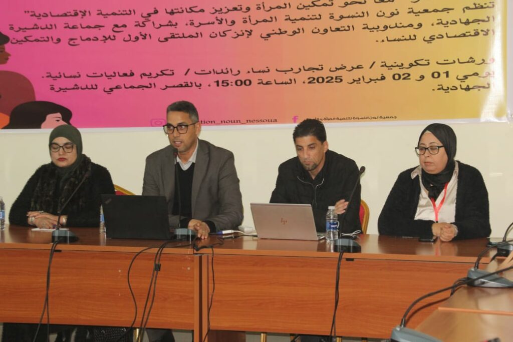 في إطار الدعم المخصص للجمعيات برسم سنة 2023 ، و بشراكة مع جماعة الدشيرة الجهادية ومندوبية التعاون الوطني لإنزكان، احتضن القصر الجماعي للدشيرة الجهادية عمالة انزكان ايت ملول، خلال يومي 1 و 2 فبراير 2025، فعاليات الملتقى الأول للإدماج والتمكين الاقتصادي للنساء، هذا الحدث من تنظم جمعية نون النسوة لتنمية المرأة والأسرة.