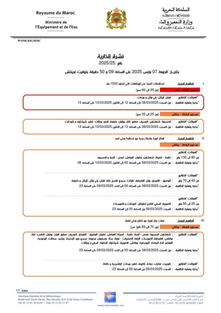 أفادت المديرية العامة للأرصاد الجوية بأن تساقطات ثلجية (25-60 سم) على المرتفعات التي تتجاوز 1500 م، وأمطار قوية أحيانا رعدية مع تساقط محلي للبرد (25-130 ملم)، وهبات رياح قوية مع تطاير محلي للغبار (70-95 كلم/س)، مرتقبة من يوم غد السبت إلى الاثنين المقبل بعدد من مناطق المملكة.