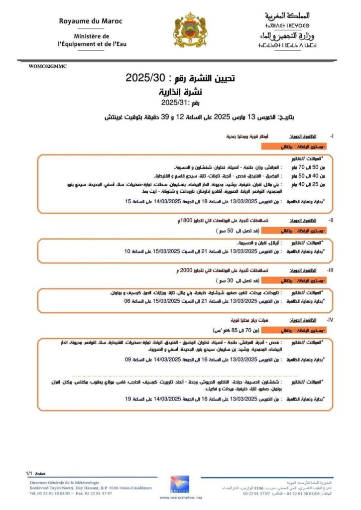 وأشارت المديرية إلى أن عدة أقاليم، منها طنجة-أصيلة، القنيطرة، الدار البيضاء، والرباط، ستشهد هبات رياح قوية تتراوح بين 70 و85 كلم/ساعة، وذلك من مساء الخميس وحتى صباح الجمعة. كما ستتأثر مناطق مثل الناظور، فاس، وجدة، تازة، وميدلت بنفس الظاهرة حتى مساء الجمعة.