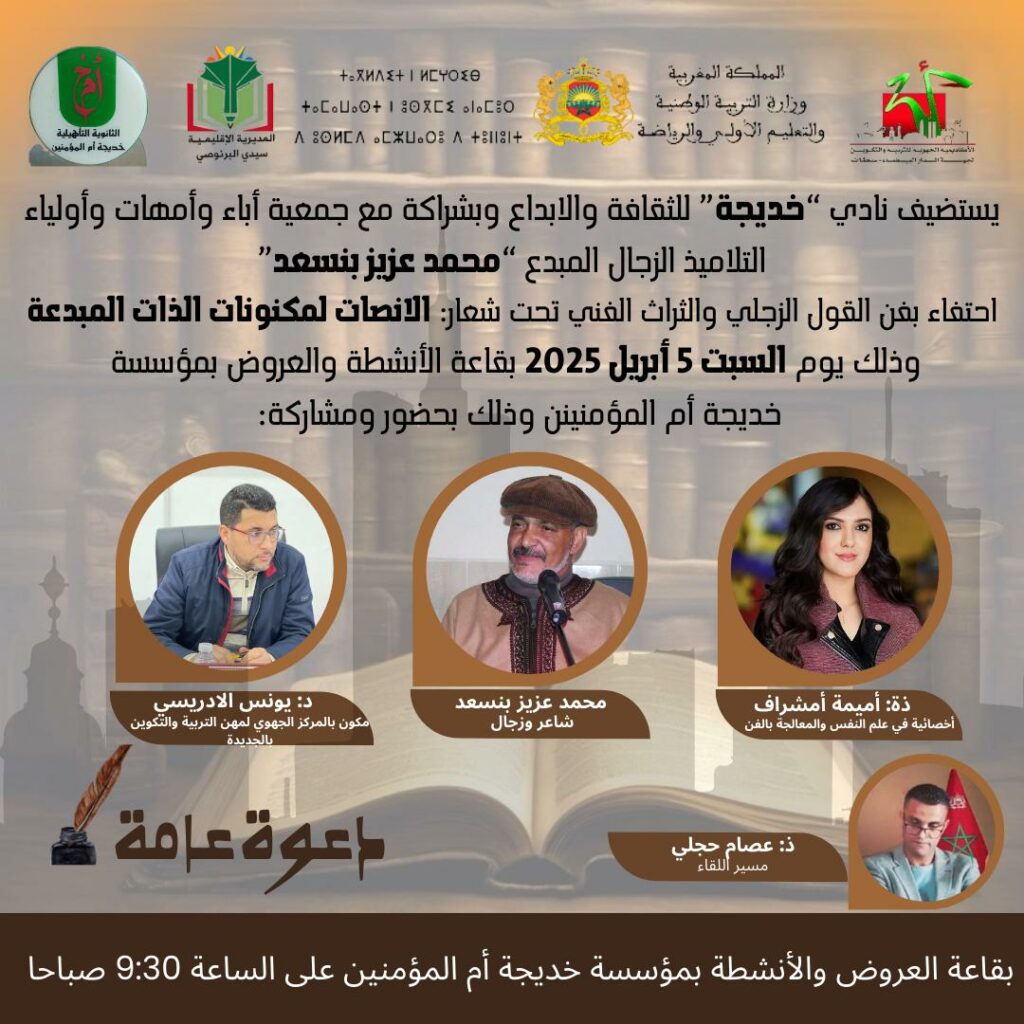 تحت شعار “الانصات لمكنونات الذات المبدعة”، واحتفاء بفن القول الزجلي والتراث الفني، يستضيف نادي “خديجة للثقافة والإبداع”، الزجال المبدع محمد عزيز بنسعد، وذلك صباح يوم السبت 5 ابريل من السنة الجارية، بقاعة الأنشطة والعروض بمؤسسة خديجة أم المؤمنين التابعة لمديرية البرنوصي بالدار البيضاء.