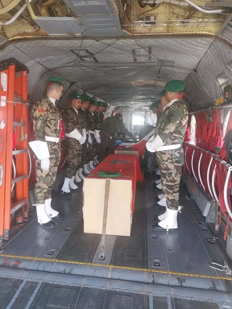 هذا وسارعت القواتُ المسلحة ُ الملكية ُ إلى تأمين نقلِ جثمانَيْ العريفين فيصل مجاهد ومحمد حسناوي بواسطة مروحيةٍ عسكريةٍ، حيث جرت مراسمُ الدفنِ بكل من بْزُو بإقليم أزيلال وعين كيشر بمدينة وادي زم، وسط أجواءٍ مهيبةٍ شهدت حضوراً رسمياً وعسكرياً، بمشاركة السلطات المحلية والدرك الملكي والقوات المساعدة.
