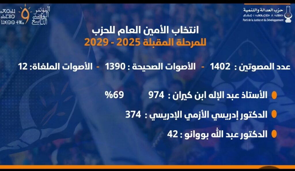 أعاد حزب العدالة والتنمية المغربي انتخاب عبد الإله بنكيران أميناً عاماً له، وذلك خلال مؤتمره الوطني المنعقد ببوزنيقة يومي السبت والأحد، في خطوة تعكس رغبة قواعد الحزب في استعادة التوازن بعد سنوات من التراجع السياسي والتنظيمي.