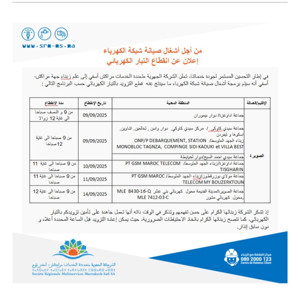 أعلنت الشركة الجهوية متعددة الخدمات مراكش–آسفي عن برمجة سلسلة من أشغال صيانة شبكة الكهرباء بإقليم الصويرة، مما قد يترتب عنه انقطاع مؤقت للتيار الكهربائي بعدد من الجماعات والمناطق، وذلك ابتداءً من يوم 9 شتنبر 2025 وإلى غاية 14 من الشهر ذاته.
