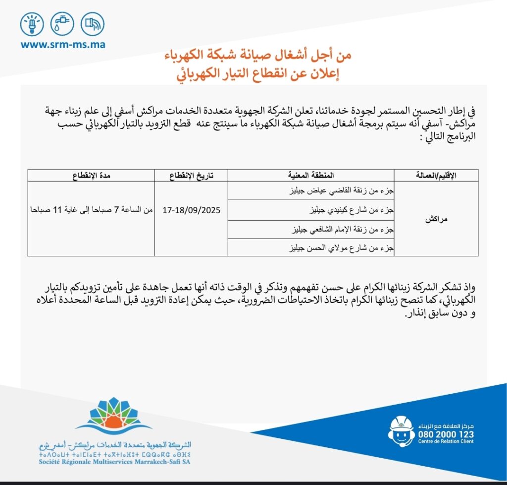 تُعلن الشركة الجهوية متعددة الخدمات بمراكش آسفي (SRM) عن انقطاع التيار الكهربائي في بعض المناطق بمدينة مراكش، وذلك لإجراء أعمال صيانة ضرورية بهدف تحسين جودة الخدمة حسب الجدول أدناه: