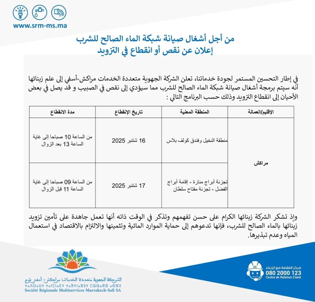 في إطار التحسين المستمر لجودة خدماتنا، تعلن الشركة الجهوية متعددة الخدمات مراكش-آسفي إلى علم زبنائها أنه سيتم برمجة أشغال صيانة لشبكة الماء الصالح للشرب مما سيؤدي إلى نقص في الصبيب و قد يصل في بعض الأحيان إلى انقطاع التزويد وذلك حسب البرنامج التالي :