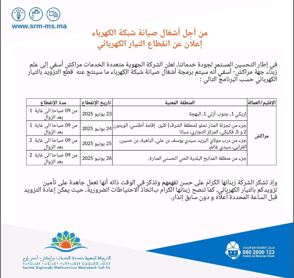 في إطار التحسين المستمر لجودة خدماتها، تعلن الشركة الجهوية متعددة الخدمات مراكش آسفي إلى علم زبنائها أنه سيتم برمجة أشغال صيانة لشبكة الكهرباء مما سينتج عنه قطع التزويد بالتيار الكهربائي بهذه الأحياء بمدينة مراكش حسب البرنامج التالي: