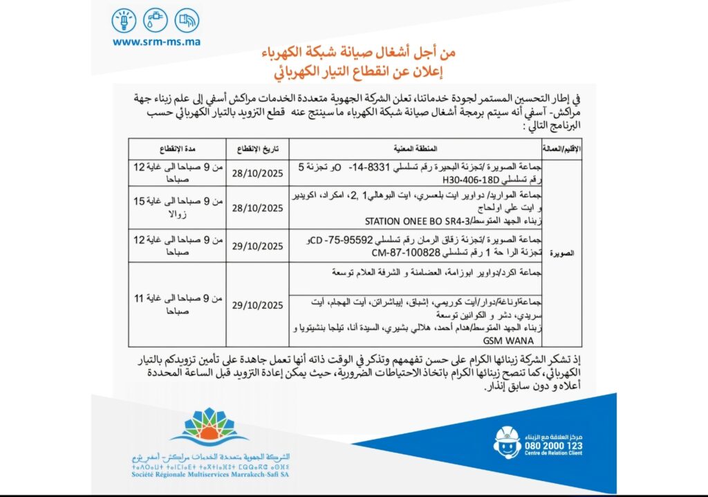 في إطار تحسين جودة الخدمات واستمرارية التزويد بالطاقة الكهربائية، أعلنت الشركة الجهوية متعددة الخدمات مراكش – آسفي أنه سيتم برمجة أشغال صيانة على مستوى شبكة الكهرباء، الأمر الذي سيتطلب قطعاً مؤقتاً للتيار الكهربائي بعدد من المناطق التابعة لجهة مراكش – آسفي، وذلك وفق البرنامج التالي: