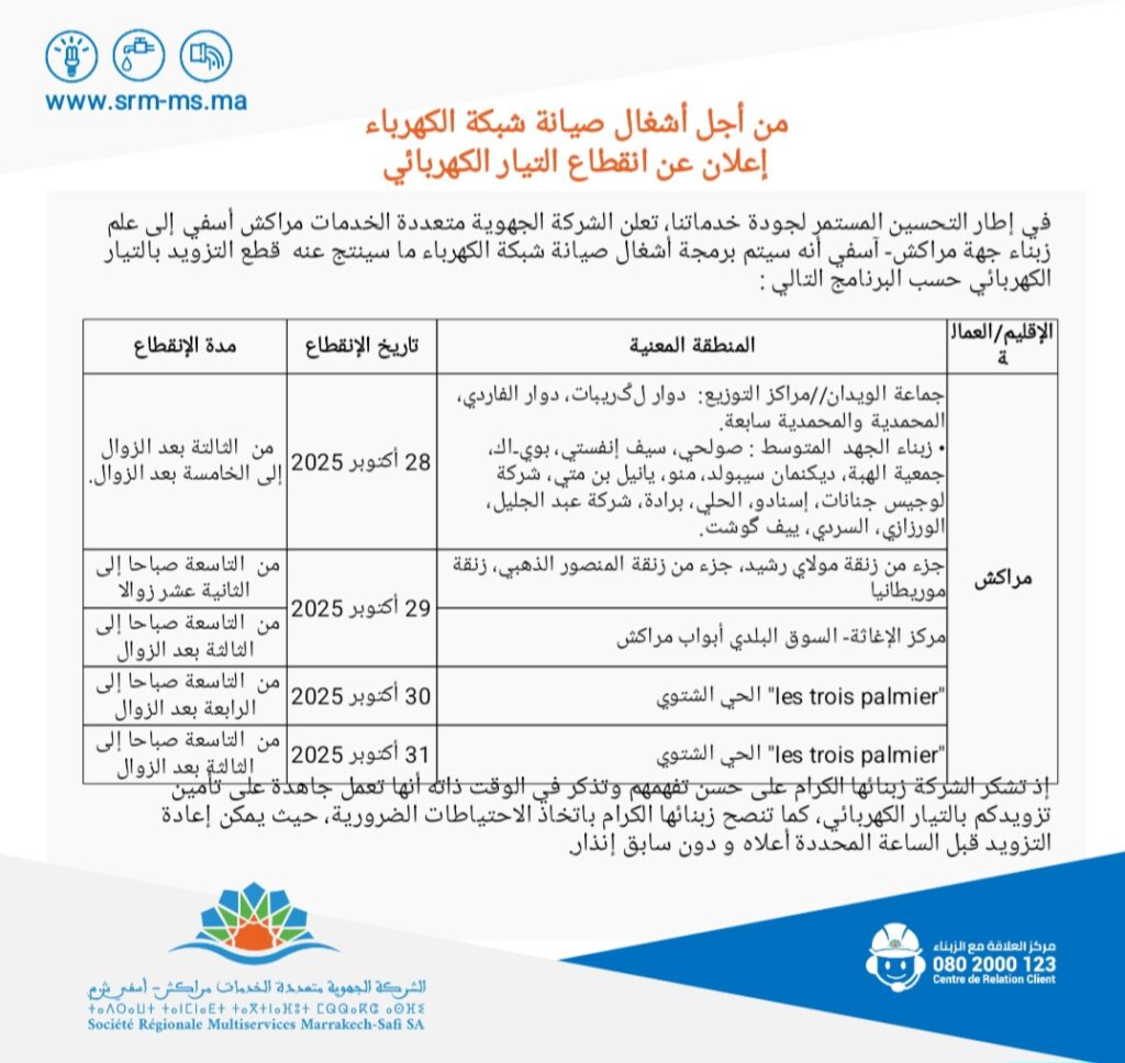 في إطار سعيها المستمر لتحسين جودة خدماتها وضمان استمرارية التزويد بالطاقة الكهربائية، أعلنت الشركة الجهوية متعددة الخدمات مراكش – آسفي عن برمجة مجموعة من أشغال صيانة شبكة الكهرباء بعدد من المناطق التابعة للجهة، وهو ما سيترتب عنه انقطاع مؤقت في التيار الكهربائي وفق الجدول الزمني التالي: