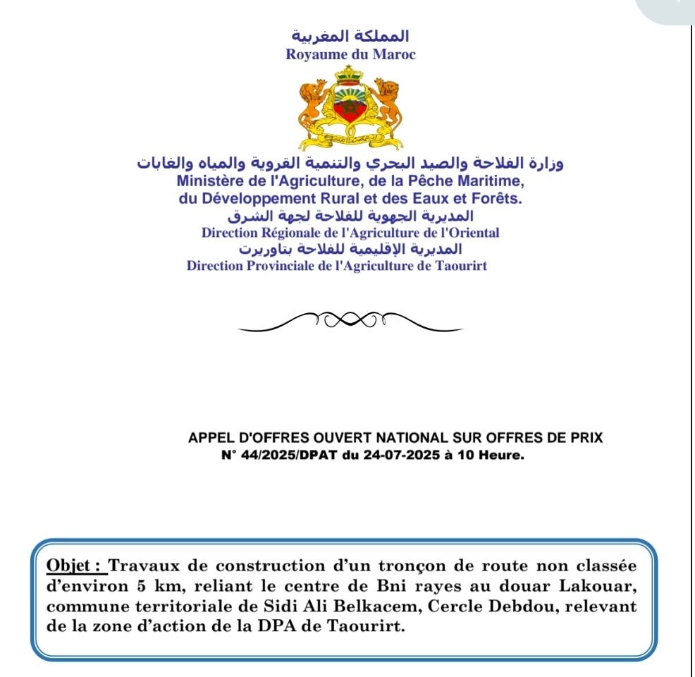 فبحسب الوثيقة الرسمية الصادرة عن المديرية الإقليمية للفلاحة بتاوريرت، تحت رقم 44/2025/DPAT بتاريخ 24 يوليوز 2025، يتعلق الأمر بـ أشغال بناء طريق غير مصنفة بطول يقارب 5 كيلومترات، ستربط مركز بني ريس بـ دوار لقوار، في نطاق الجماعة الترابية سيدي علي بلقاسم، دائرة دبدو، ضمن النفوذ الترابي للمديرية الإقليمية للفلاحة بتاوريرت، التابعة للمديرية الجهوية للفلاحة لجهة الشرق.