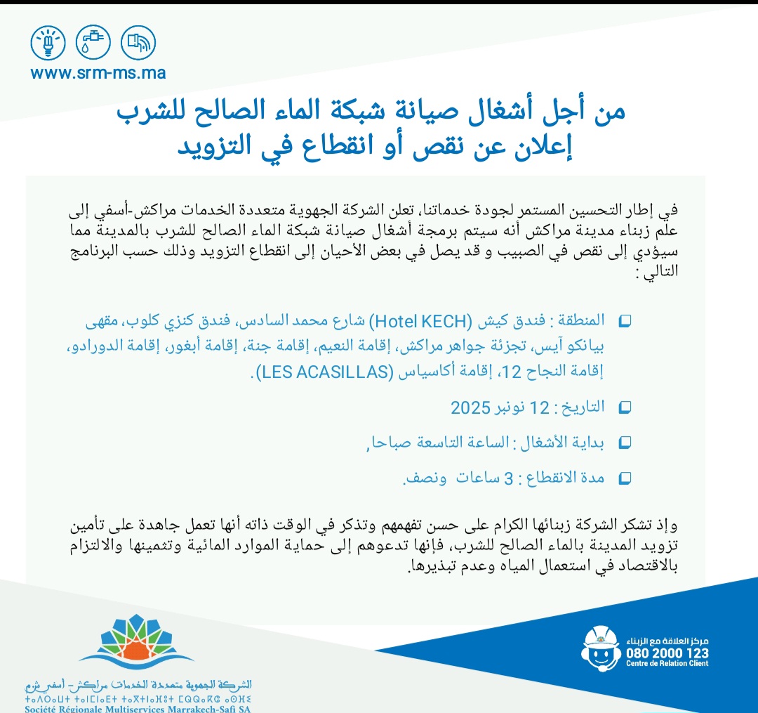 في إطار سعيها المتواصل للرفع من جودة خدماتها وضمان استمرارية التزويد بالماء الصالح للشرب، أعلنت الشركة الجهوية متعددة الخدمات مراكش–آسفي عن برمجة تدخل تقني هام على مستوى شبكة توزيع الماء بمدينة مراكش، وذلك يوم الأربعاء 12 نونبر 2025 ابتداءً من الساعة التاسعة صباحًا، ولمدة تقارب ثلاث ساعات ونصف.