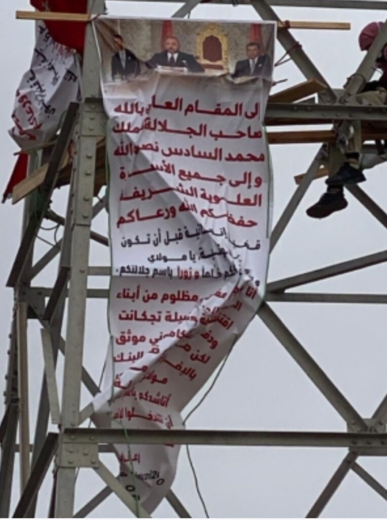 واكدت مصادر من عين المكان، تمركز الشخص على ارتفاع شاهق من البرج الحديدي، حيث قام بتعليق لافتة مطلبية طويلة موجهة إلى المقام السامي لجلالة الملك محمد السادس يشتكي فيها من الظلم وقضايا اقتصادية مرتبطة بـ”وسيلة تجاكرت” . اللافتة كشفت عن الأسباب العميقة وراء هذا الفعل اليائس، التي تعود بالأساس إلى خلافات اجتماعية ومالية دفعته إلى اتخاذ هذا الموقف الحرج.
