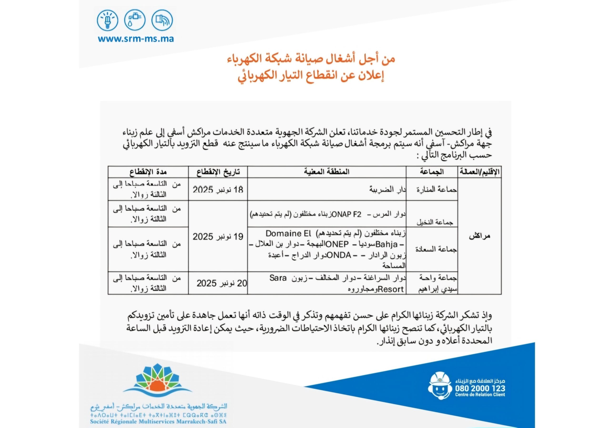 أعلنت الشركة الجهوية متعددة الخدمات مراكش–آسفي عن برمجة مجموعة من أشغال صيانة شبكة الكهرباء، ما سيترتب عنه انقطاع مؤقت للتيار الكهربائي بعدد من المناطق التابعة لإقليم الحوز وعمالة مراكش، وذلك خلال الفترة الممتدة من 18 إلى 20 نونبر 2025.