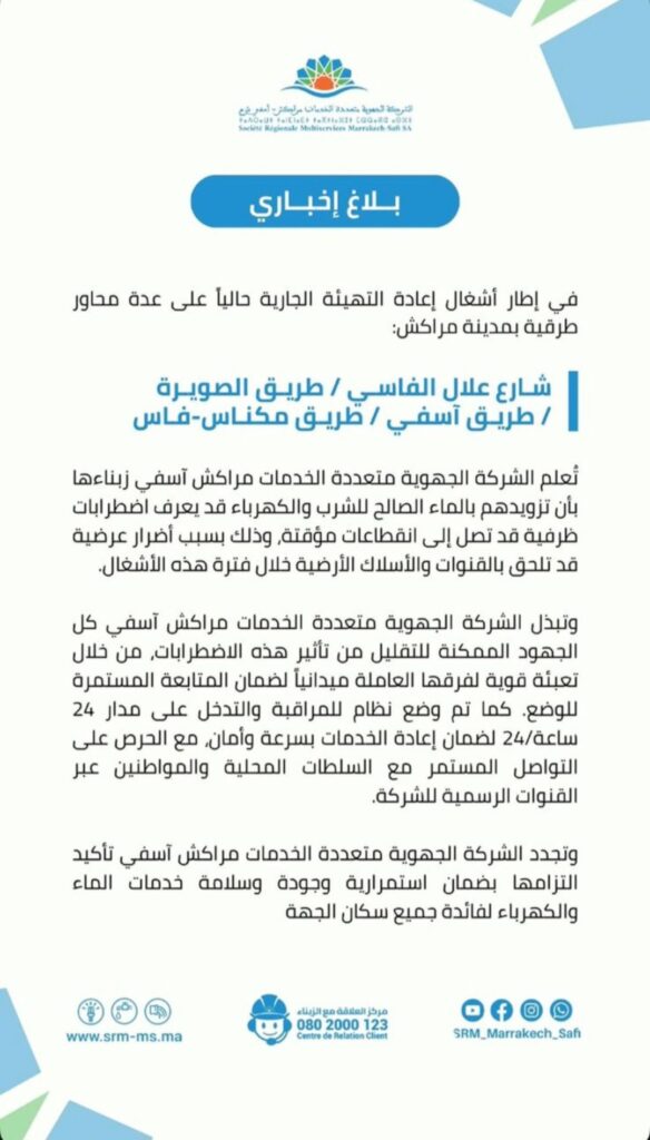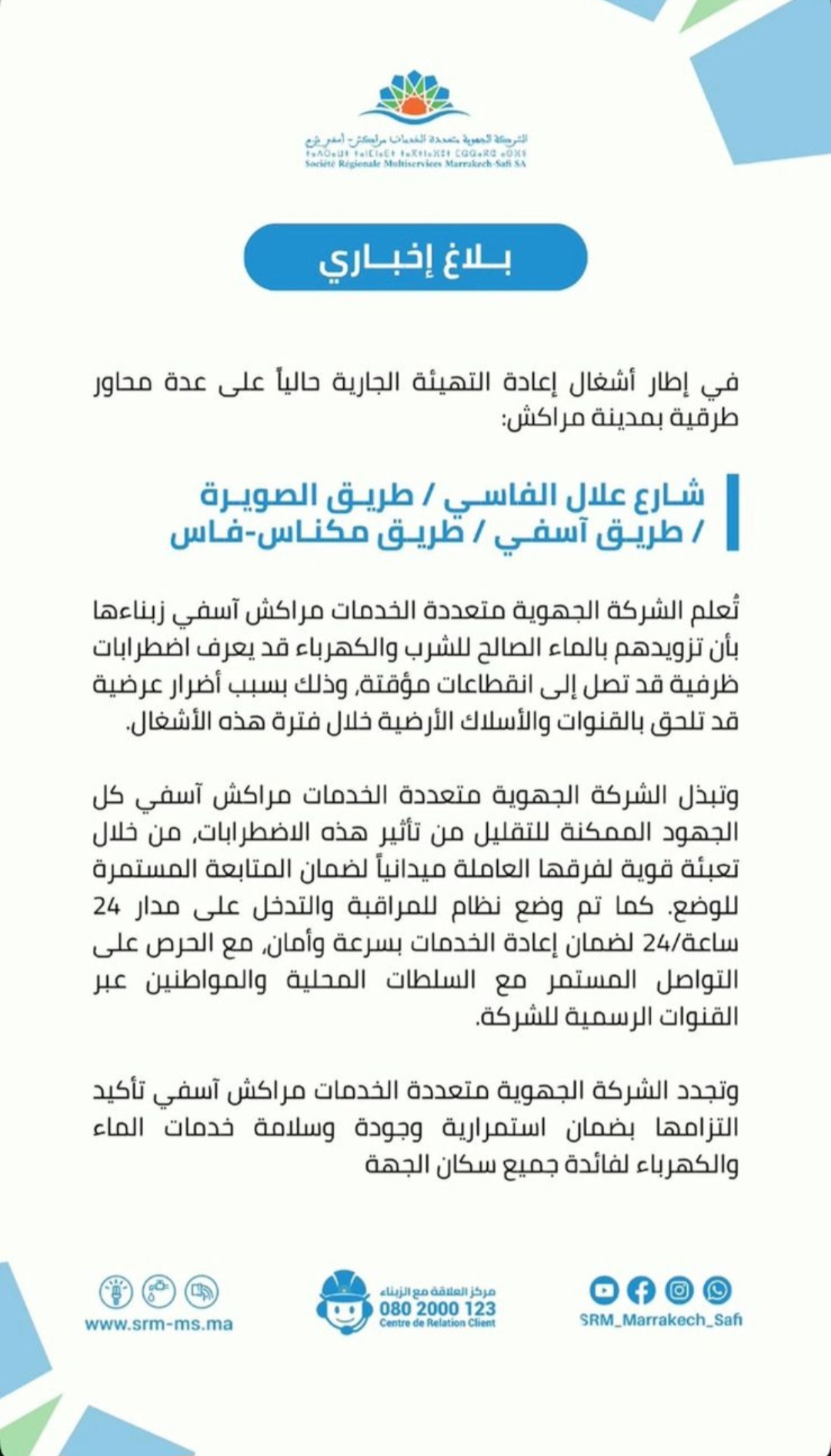 وفي سياق متصل، أبرز البلاغ أهمية التنسيق المتواصل بين الشركة والسلطات المحلية، إضافة إلى فتح قنوات التواصل مع المواطنين عبر المنصات الرسمية ومركز علاقة الزبناء رقم 0802000123.