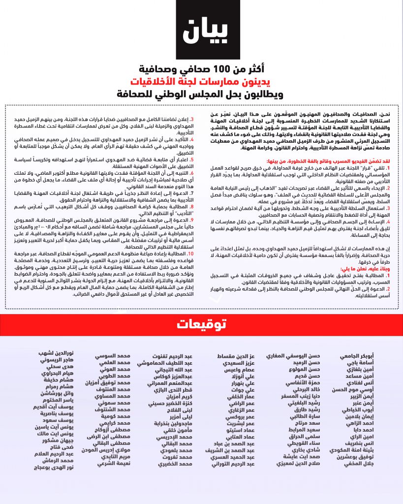 ورفع الموقعون سقف المواجهة بالمطالبة بفتح تحقيق عاجل وشفاف لترتيب المسؤوليات القانونية، والدعوة الصريحة إلى “توقيف أعضاء اللجنة الذين ظهروا في التسجيل”، مؤكدين تضامنهم المطلق مع الصحافيين حميد المهداوي ولبنى فلاح باعتبارهم ضحايا لهذه الممارسات الانتقامية، كما شدد البيان على أن نشر المهداوي للتسجيل يدخل في صميم “العمل الصحافي الاستقصائي” لكشف الحقيقة ولا يمكن أن يكون مبرراً لأي متابعة قضائية، بل إن أي تحرك ضده يعتبر “تكريساً لسياسة التضييق”.