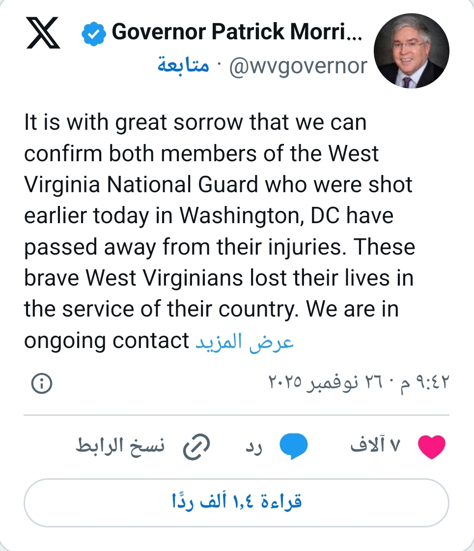 أعلن حاكم ولاية “ويست فرجينيا” ، باتريك موريسي، مساء اليوم الأربعاء، عن مقتل اثنين من أفراد الحرس الوطني التابعين للولاية في حادث إطلاق نار وقع بالقرب من البيت الأبيض في العاصمة واشنطن.
