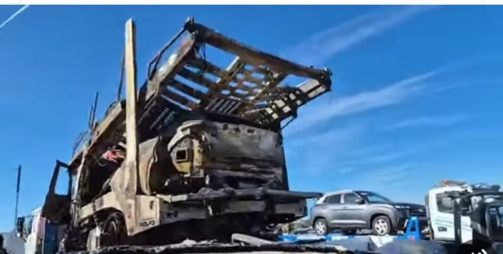 عاجل : النيران تلتهم شحنة سيارات جديدة بالكامل بالطريق السيار قرب” تامسنا”
