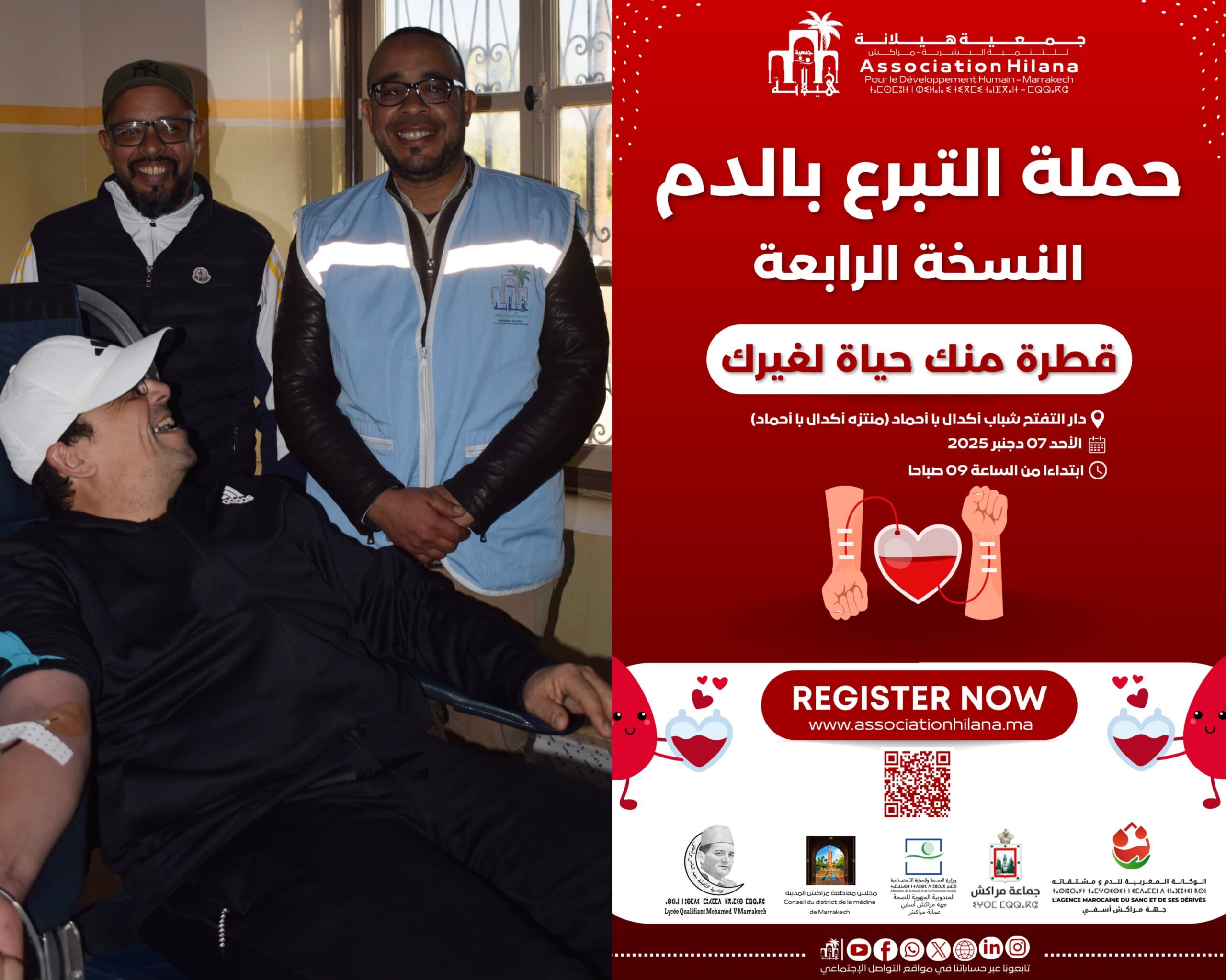 في مشهد يعكس أسمى معاني التكافل والتضامن المجتمعي، وتجسيدًا حيًا للآية الكريمة: وَمَنْ أَحيَاهَا فَكَأَنَّمَا أَحيَا النَّاسَ جَمِيعًا، نظمت جمعية هيلانة للتنمية البشرية بمراكش حملة استثنائية للتبرع بالدم، بالتعاون الوثيق مع الوكالة الوطنية للدم ومشتقاته.
