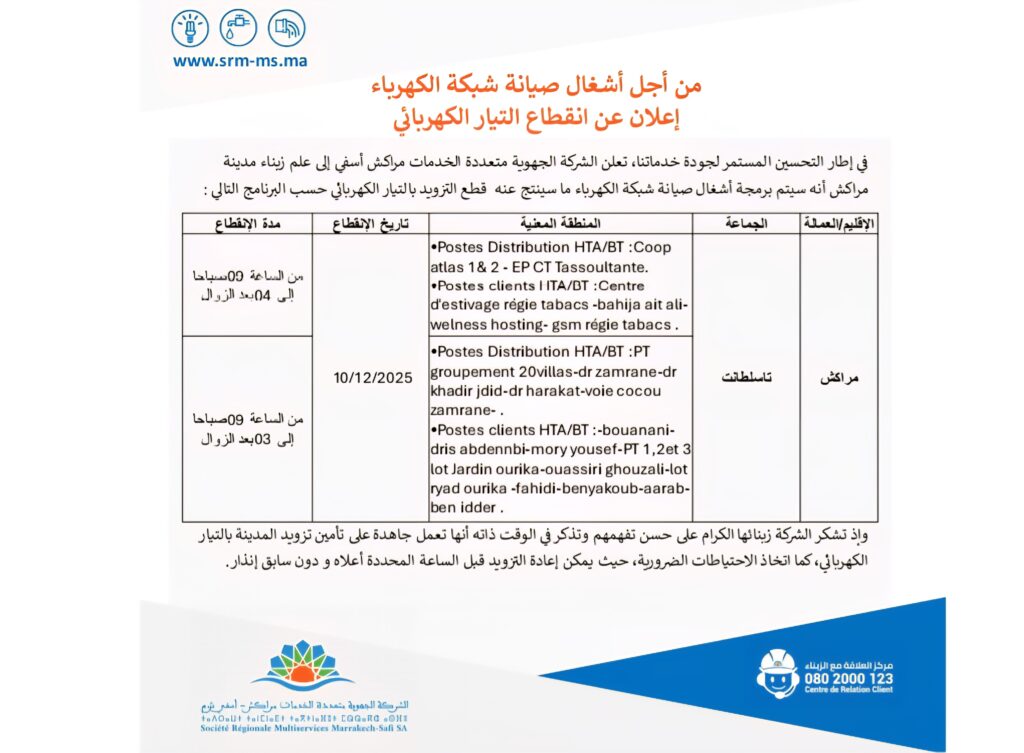 أعلنت الشركة الجهوية متعددة الخدمات بمراكش–آسفي، في إطار تحسين جودة خدماتها وضمان استمرارية التزويد بالكهرباء، عن برمجة أشغال صيانة على مستوى شبكة التوزيع، الأمر الذي سيترتب عنه انقطاع مؤقت للتيار الكهربائي بعدد من المناطق التابعة لعمالة مراكش، يوم 10 دجنبر 2025.