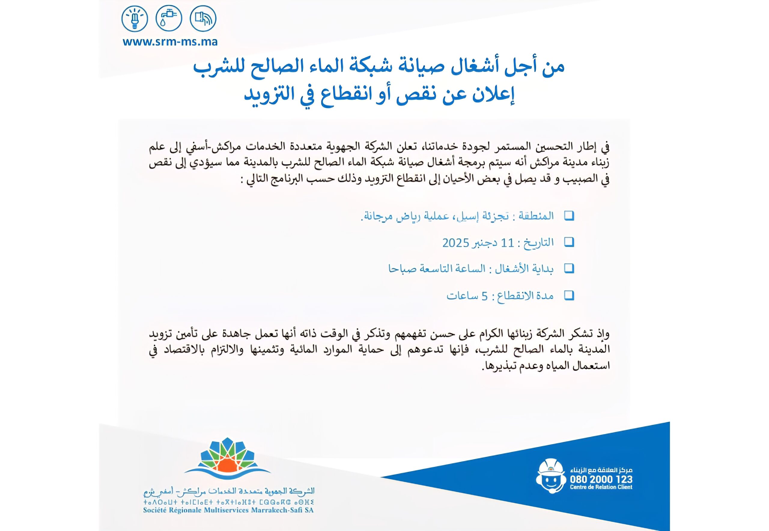 في إطار تحسين جودة خدماتها، تخبر الشركة الجهوية متعددة الخدمات مراكش-آسفي ساكنة مدينة مراكش بأنها ستقوم بإنجاز أشغال صيانة مهمة على شبكة الماء الصالح للشرب، الأمر الذي سيترتّب عنه تسجيل انخفاض في الصبيب قد يصل أحياناً إلى انقطاع مؤقت للتزويد، وذلك يوم الخميس 11 دجنبر 2025، ابتداء من الساعة التاسعة صباحاً ولمدة تُقدّر بخمس ساعات، على مستوى تجزئة اليسار وعمليات رياض مرجانة.