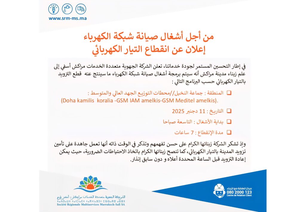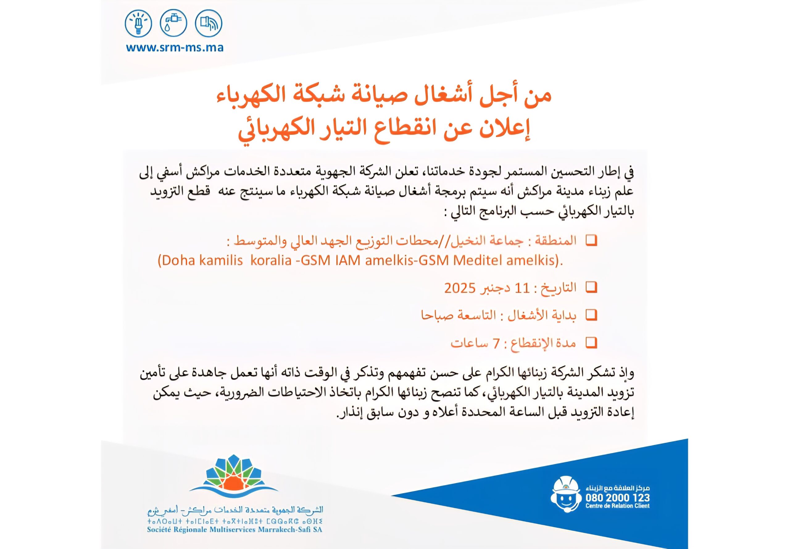 في إطار حرص الشركة الجهوية متعددة الخدمات مراكش آسفي على تحسين جودة خدماتها وضمان استمرارية التزويد بالكهرباء، تُعلن الشركة لزبنائها الكرام عن برمجة أشغال مهمة لصيانة شبكة الكهرباء يوم الخميس 11 دجنبر 2025، وذلك على مستوى جماعة النخيل ومحطات التوزيع بالجهد العالي والمتوسط (Doha kamilis – Koralia – GSM IAM Amelkis – GSM Meditel Amelkis).