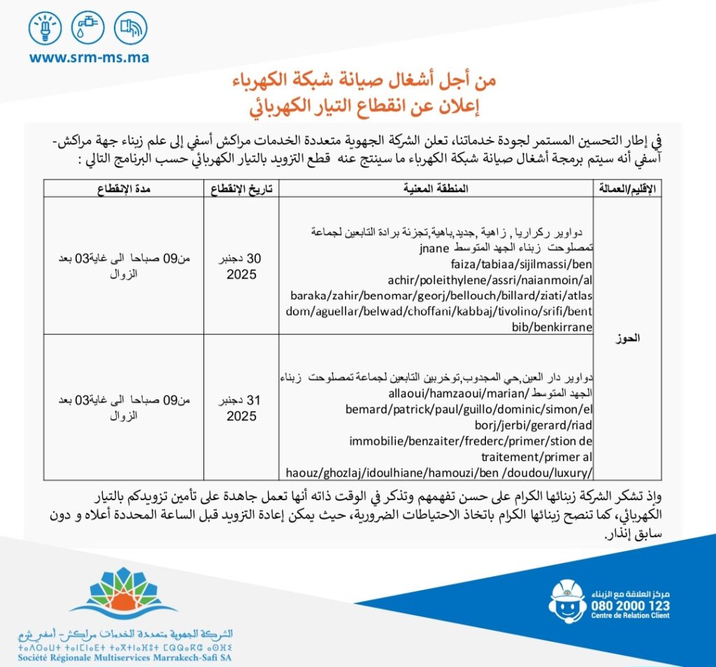 تُعلن الشركة الجهوية متعددة الخدمات مراكش–آسفي عن انقطاع مؤقت للتيار الكهربائي بعدد من الأحياء التابعة لجماعة تسلطانت (عمالة الحوز)، وذلك من الساعة التاسعة صباحاً إلى غاية الثالثة بعد الزوال، في إطار أشغال صيانة شبكة الكهرباء.