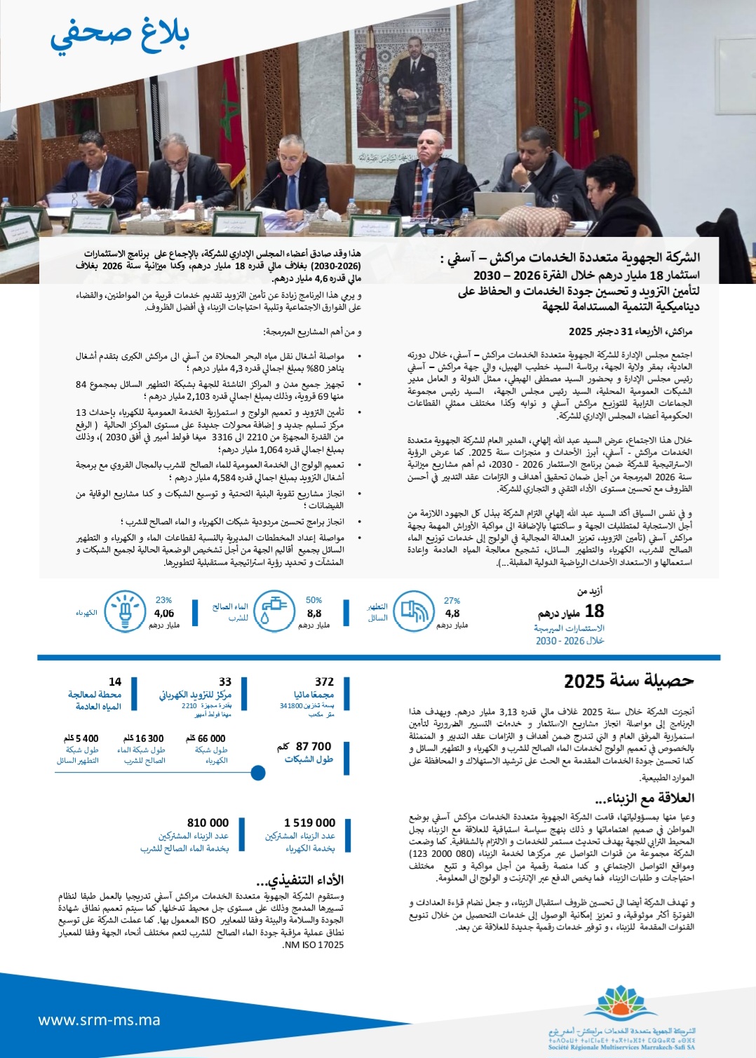 استثمارات كبرى لتعزيز جودة الخدمات: الشركة الجهوية متعددة الخدمات مراكش–آسفي ترصد 18 مليار درهم للفترة 2026–2030