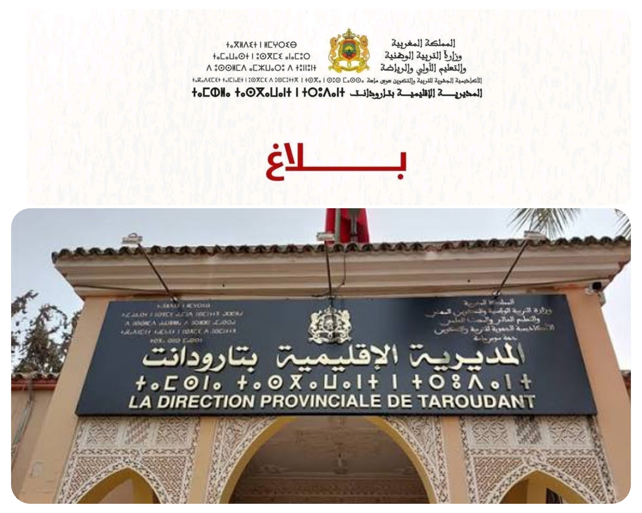 أعلنت المديرية الإقليمية بتارودانت، التابعة لوزارة التربية الوطنية والتعليم الأولي والرياضة، عن تعليق الدراسة بشكل استثنائي بجميع المؤسسات التعليمية بالإقليم يومي الجمعة 2 والسبت 3 يناير 2026.