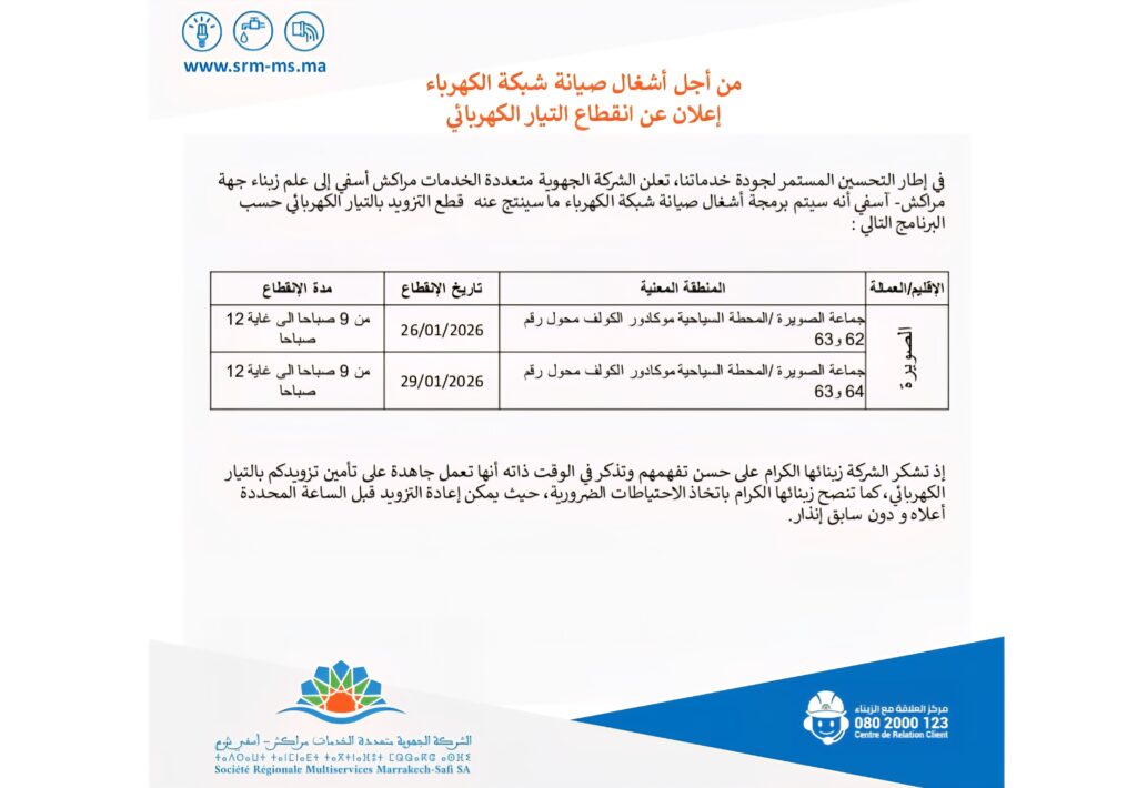 في إطار التحسين المستمر لجودة خدماتها، تُخبر الشركة الجهوية متعددة الخدمات مراكش–آسفي ساكنة جماعة الصويرة بأنه سيتم برمجة أشغال صيانة على مستوى شبكة الكهرباء، مما سيترتب عنه انقطاع مؤقت في التزود بالتيار الكهربائي، وذلك حسب البرنامج التالي: