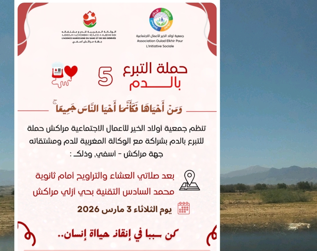 تتجسد قيم التكافل الاجتماعي في أبهى صورها مع حلول شهر رمضان المبارك بمدينة مراكش، حيث أعلنت جمعية “أولاد الخير للأعمال الاجتماعية” عن تنظيم النسخة الخامسة من حملتها الإنسانية الكبرى للتبرع بالدم، وذلك بشراكة إستراتيجية مع الوكالة المغربية للدم ومشتقاته لجهة مراكش آسفي.