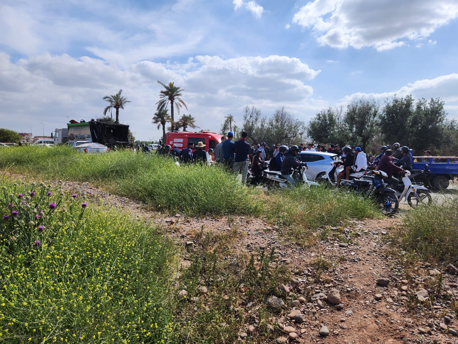شهدت الطريق الرابطة بين منطقتي أزلي والمحاميد بمراكش، وتحديداً في المقطع الطرقي الواقع خلف أسوار المطار، حادثة سير مروعة في هذه الأثناء، أسفرت عن مصرع سائق دراجة نارية من صنع صيني في عين المكان.