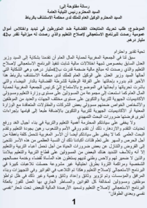 وحسب نفس الرسالة فقد “حصلت تلاعبات كبيرة في البرنامج الإستعجالي لإصلاح التعليم وهكذا تم التلاعب في الفواتير وفي التجهيزات وبناء المرافق والمؤسسات وتم تزوير وثائق وإعداد وثائق وهمية وغير ذلك في ظل تواطئ موظفين ومسوؤلين لمخالفة كل القوانين والمساطر الجاري بها العمل”.