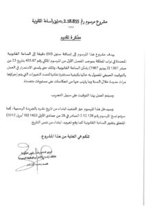 ويوضح مشروع المرسوم أنه سيتم العمل بهذا التوقيت على سبيل التجريب، وسيدخل هذا المرسوم حيز التنفيذ ابتداء من تاريخ نشره بالجريدة الرسمية.