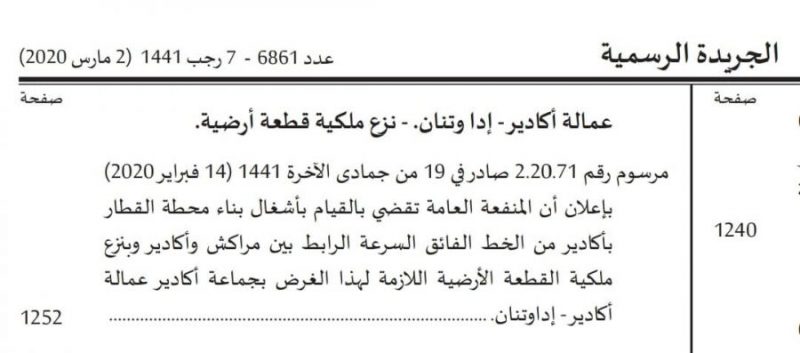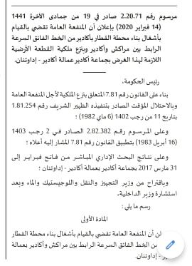 في هذا الإطار، صُدر في آخر عدد من الجريدة الرسمية، مرسوم رقم 2.20.71 يقضي بنزع ملكية القطعة الأرضية، اللازمة من أجل بدء أشغال بناء محطة القطار بمدينة أكادير، الخاصة بمشروع الخط السككي فائق السرعة الرابط بين مراكش وأكادير.
