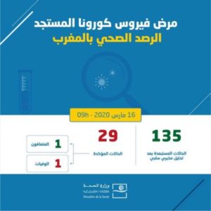 وارتفع عدد الإصابات في المغرب وفق منشور الوزارة على صفحتها الرسمية بـ “الفايسبوك” إلى 29 حالة بعد أن كانت قد سجلت أمس 28 حالة إصابة.