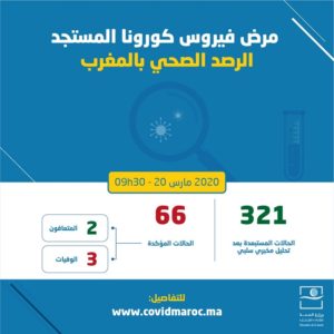 أعلنت وزارة الصحة، على بوابتها الرسمية لفيروس كورونا المستجد بالمغرب “www.covidmaroc.ma” أنه تم إلى غاية اليوم الجمعة 20 مارس، على الساعة التاسعة والنصف صباحا، تسجيل 3 اصابات جديدة مؤكدة بفيروس “كورونا” المستجد، تم تأكيدها مخبريا بمعهد باستور-المغرب والمختبر الوطني للأنفلونزا والفيروسات التنفسية بالمعهد الوطني للصحة بالرباط.