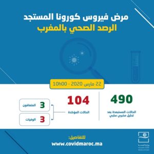 أعلنت وزارة الصحة، على بوابتها الرسمية الخاصة بفيروس كورونا المستجد بالمغرب “www.covidmaroc.ma”، عن ارتفاع عدد حالات الإصابة المؤكدة بفيروس “كورونا” المستجد بالمغرب إلى 104 حالات حتى الساعة العاشرة من صباح اليوم الأحد .