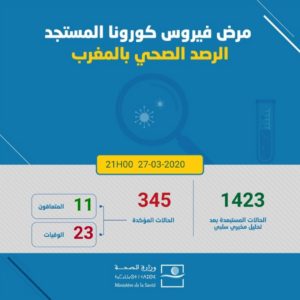أعلنت وزارة الصحة، اليوم الجمعة، تسجيل 12 إصابة جديدة بفيروس كورونا المستجد، ليرتفع العدد الإجمالي لحالات الإصابة المؤكدة بالفيروس في المغرب إلى 345 حالة إلى حدود الساعة التاسعة مساء.