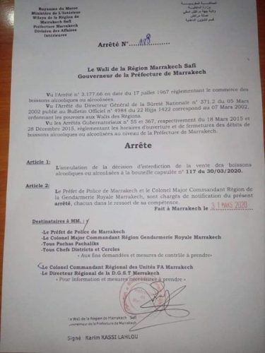 وحسب القرار الجديد الذي اطلعت “الملاحظ جورنال” على نسخة منه، فإن منع بيع المشروبات الكحولية الصادر تحت رقم 117 بتاريخ 30 مارس 2020، صار لاغيا بموجب القرار الجديد الصادر مساء الثلاثاء 31 مارس”.