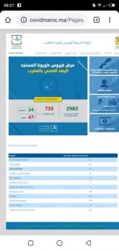 ووفق الموقع الإلكتروني للوزارة ذاتها فإن عدد الحالات المستبعدة، بعد تحاليل مختبرية سلبية، قد بلغ 2983 منذ بداية انتشار الفيروس بالبلاد، فيما بلغ عدد المتعافين من فيروس “كورونا” في المغرب، 34 حالة، بتسجيل 3 حالات شفاء جديدة، وعدد الوفيات ارتفع إلى 47 ضحية بتسجيل 3 حالات وفاة جديدة.