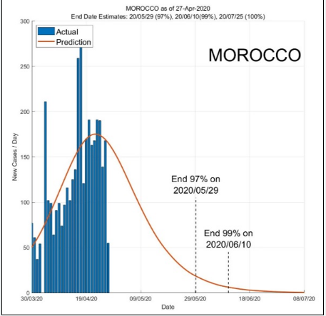 وتوقعت ذات الدراسة التي اعتمدت على البيانات الرسمية المقدمة من عدد من دول العالم حول الإصابات ودورة حياة الفيروس، أن انتهاء الأزمة بنسبة 99 بالمائة سيكون في حدود 12 يونيو المقبل، في انتظار أن يختفي الوباء كليا بنسبة 100 في المائة في 29 يوليوز المقبل.