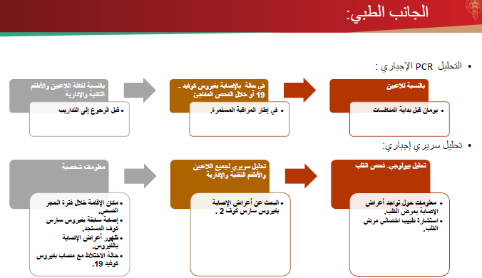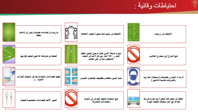 وفي حالة ظهور أعراض فيروس كوفيد 19 يجب إيقاف التداريب وعزل فوري للمصاب واخضاعه للمراقبة الطبية.