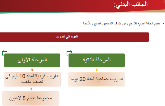 إذا كان اللاعب لم يسبق له أن أصيب بفيروس كوفيد 19 وكانت التحاليل الفيروسية وفحوصات القلب سلبية يسمح له أن يتدرب تحت مراقبة طبية صارمة بمعدل مرتين أو أكثر في اليوم.