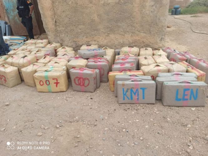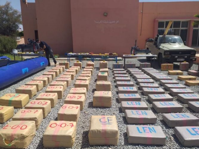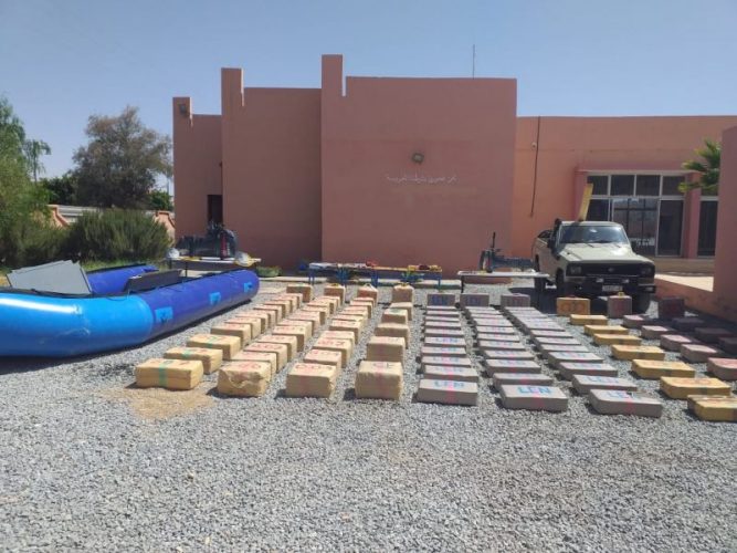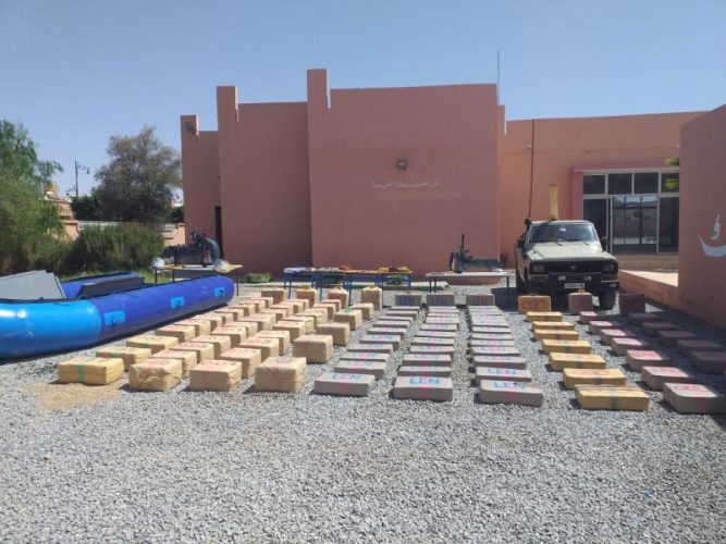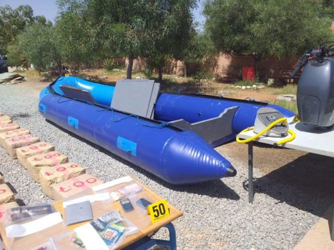 وأضاف المصدر ذاته أنه مواصلة للأبحاث في هذه القضية، تم توقيف المشتبه فيه الثالث بضيعة فلاحية تقع بمنطقة “تكانت” التي تبعد بحوالي 35 كيلومترا عن مدينة كلميم في اتجاه مدينة أكادير، حيث أسفرت عمليات التفتيش المنجزة بهذه الضيعة عن حجز 104 حزمة من المخدرات يبلغ وزنها الإجمالي طنين و940 كيلوغراما من مخدر الشيرا، فضلا عن حجز قارب مطاطي ومحركات مائية وأجهزة للملاحة البحرية، يشتبه في استعمالها في تهريب المخدرات عبر المسالك البحرية.