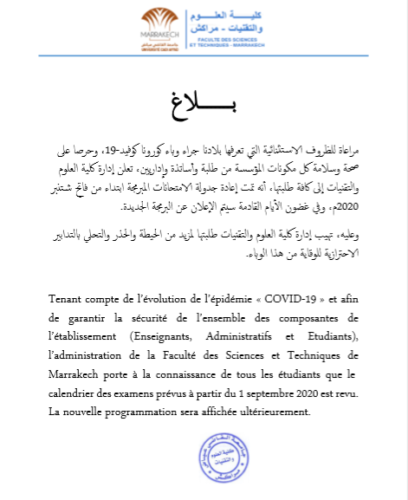 أعلنت كلية العلوم والتقنيات التابعة لجامعة القاضي عياض بمراكش، تأجيل موعد الامتحانات المؤجلة برسم الدورة الربيعية للموسم الجامعي 2019ـــ2020، مراعاة للظروف الاستثنائية التي تعرفها البلاد جراء تفشي وباء “كوفيد19”.