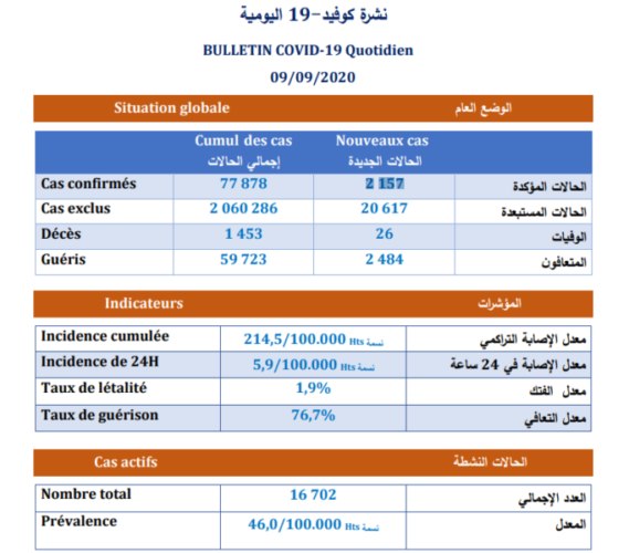 وتم التأكد من 2484 حالة شفاء إضافية؛ لترتفع الحصيلة الإجمالية للتعافي الكامل إلى59723 . فيما بلغ عدد الحالات المستبعدة، بعد الحصول على نتائج سلبية تهم التحاليل المختبرية، 2060686 منذ بداية انتشار الفيروس على المستوى الوطني؛ في 2 مارس الماضي.