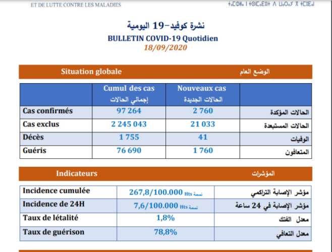 وحسب المعطيات الرسمية لوزارة الصحة المنشورة على موقعها الإلكتروني، فقد تم خلال الفترة نفسها تسجيل 41 وفاة جديدة، ليصل عدد الوفيات إلى 1755 حالة، بمعدل فتك بلغ %1،8، وتم التأكد من 1760 حالة شفاء إضافية؛ لترتفع الحصيلة الإجمالية للتعافي الكامل إلى 76690، بمعدل تعافي بلغ 78.8.