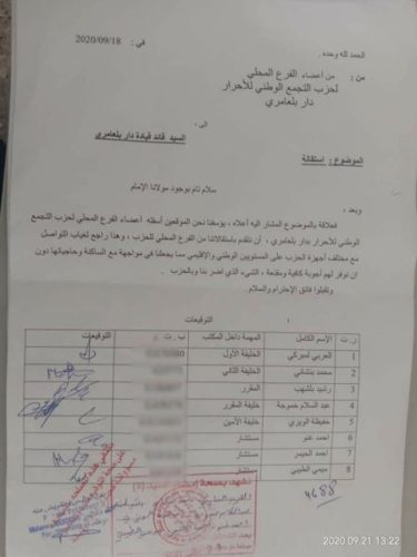 آخر هزة تعرض لها حزب التجمع الوطني للاحرار، جاءت يومين فقط؛ من إقليم سيدي سليمان، حيث أبلغ أعضاء الفرع المحلي للحزب المذكور بجماعة دار بلعماري، استقالتهم بشكل جماعي، في مراسلة موجهة إلى قائد قيادة دار بلعماري، تتوفر “الملاحظ جورنال” على نظير منها.
