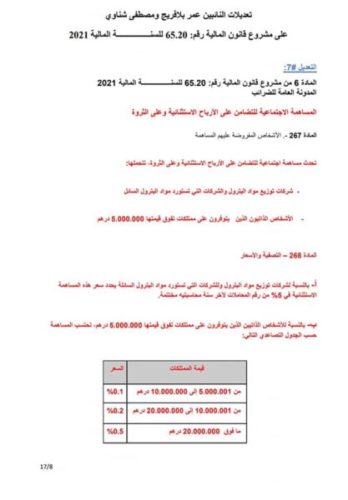 واقترح برلمانيو فدرالية اليسار، فرض “المساهمة الإجتماعية للتضامن على الأرباح الإستثنائية وعلى الثروة”، على الأشخاص الذاتيين الذين يتوفرون على ممتلكات تفوق قيمتها 5 ملايين درهم، وعلى شركات توزيع مواد البترول، والتي تستورد مواد البترول السائل.