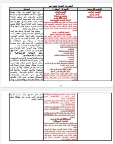 من جهة أخرى، اقترحت المجموعة النيابية لحزب التقدم والإشتراكية بمجلس النواب، بخصم ٪0.5 من ممتلكات الأشخاص الطبيعيين، الذين يتوفرون على ممتلكات تتراوح قيمتها ما بين 10 ملايين درهم و 15مليون درهم، وخصم ٪1 بالنسبة للذين يتوفرون على ممتلكات تبلغ قيمتها ما بين 30000001 درهم و60000000، باعتبارها ضريبة سنوية على الثروة.