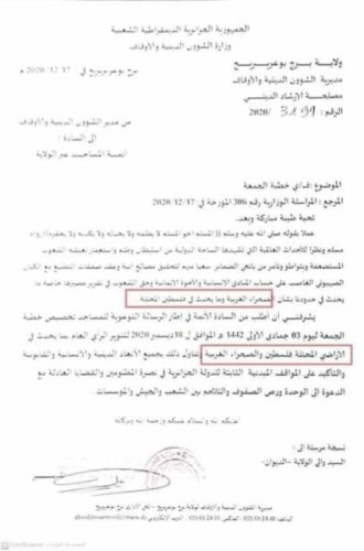 المراسلة المؤرخة بتاريخ يوم الخميس 17 دجنبر، تحث فيها الوزارة كل الأئمة على ” تنوير الرأي العام بما يحدث في فلسطين والصحراء الغربية، وتناول ذلك بجميع الأبعاد الدينية والانسانية والقانونية، والتأكيد على المواقف الثابتة للدولة الجزائرية في نصرة المظلومين والقضايا العادلة مع الدعوة إلى الوحدة ورص الصفوف والتلاحم بين الشعب والجيش والمؤسسات”، على حد تعبير الوثيقة.